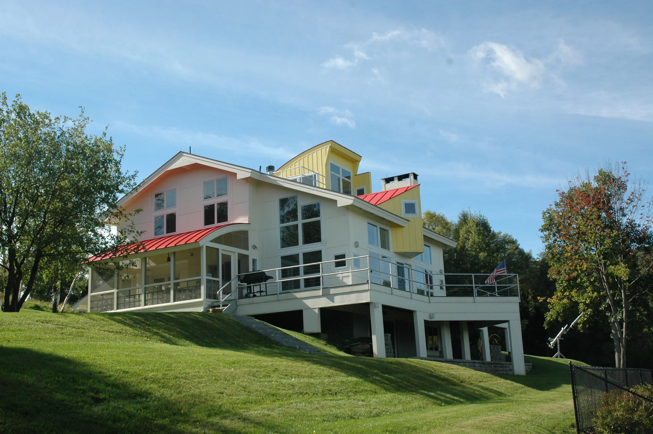 "When I go out at night I leave the tower room lights on so when I come back home I can see the house from across the valley. The stepped windows make an interesting pattern and the tower is like a beacon that welcomes me home. I love the way it looks when I drive up to the house; it looks sculptural."